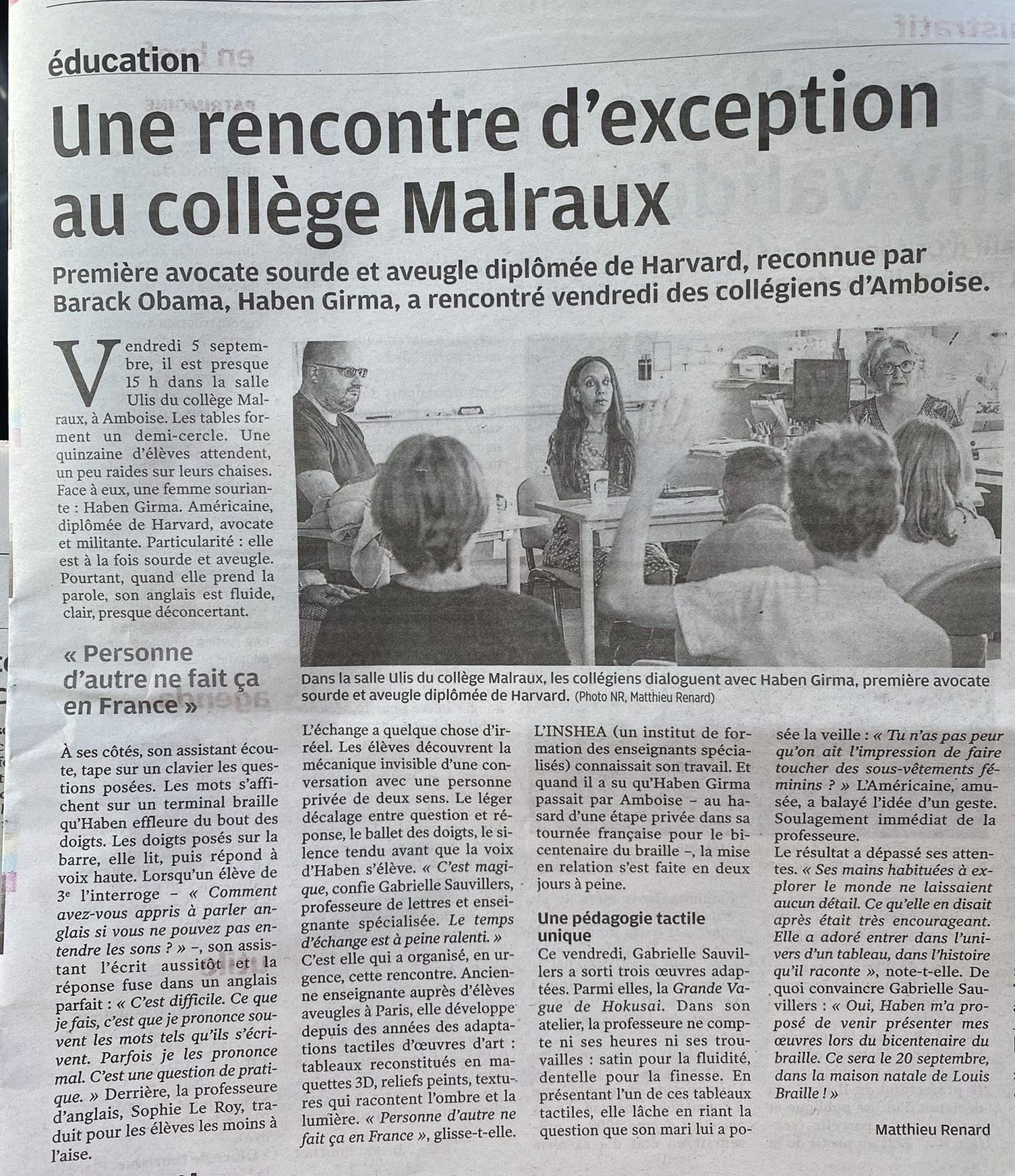 Vendredi 5 septembre, il est presque 15 h dans la salle Ulis du collège Malraux, à Amboise. Les tables forment un demi-cercle. Une quinzaine d’élèves attendent, un peu raides sur leurs chaises. Face à eux, une femme souriante : Haben Girma. Américaine, diplômée de Harvard, avocate et militante. Particularité : elle est à la fois sourde et aveugle. Son anglais, quand elle prend la parole, est précis, fluide et clair, presque déconcertant.