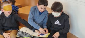 - Commencer par expliquer aux enfants qu’ils pourront toucher les illustrations et le braille dans ce livre en faisant attention à ne pas l’abîmer. Proposer de “mimer” comment ils feront pour toucher les illustrations quand elles seront sous leurs doigts.