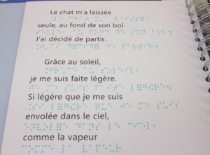 Dans cet album, le braille est imprimé en “ligne à ligne” c’est-à-dire qu’il est écrit la même chose en braille et en gros caractères sur chaque ligne. C’est idéal pour une lecture partagée entre voyant et non voyant ! Avec un enfant qui ne lit pas encore le braille, l’adulte peut lire la phrase à voix haute pendant que l’enfant touche les points braille de la même phrase.
